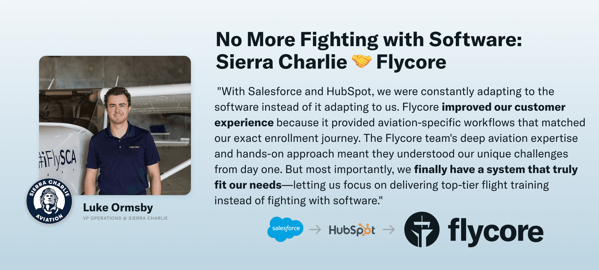 "With Salesforce and HubSpot, we were constantly adapting to the software instead of it adapting to us. Flycore improved our customer experience because it provided aviation-specific workflows that matched our exact enrollment journey. The Flycore team's deep aviation expertise and hands-on approach meant they understood our unique challenges from day one. But most importantly, we finally have a system that truly fit our needs—letting us focus on delivering top-tier flight training instead of fighting with software." - Luke Ormsby, VP Operations